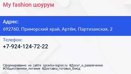 My fashion, шоурум по адресу 692760, Приморский край, Артём, Партизанская, 2 в дальнейшем Организация, размещена в следующих категориях: