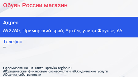 Обувь России, магазин по адресу 692760, Приморский край, Артём, улица Фрунзе, 65 в дальнейшем Организация, размещена в следующих категориях: