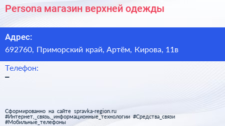 Persona, магазин верхней одежды по адресу 692760, Приморский край, Артём, Кирова, 11в в дальнейшем Организация, размещена в следующих категориях: