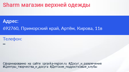 Sharm, магазин верхней одежды по адресу 692760, Приморский край, Артём, Кирова, 11в в дальнейшем Организация, размещена в следующих категориях: