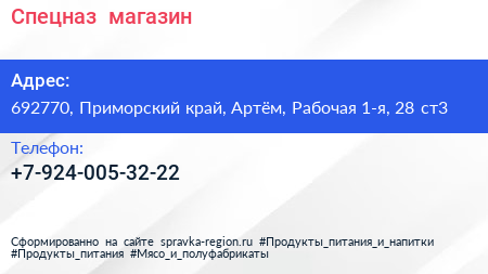 Спецназ+, магазин по адресу 692770, Приморский край, Артём, Рабочая 1-я, 28 ст3 в дальнейшем Организация, размещена в следующих категориях: