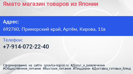 Ямато, магазин товаров из Японии по адресу 692760, Приморский край, Артём, Кирова, 11в в дальнейшем Организация, размещена в следующих категориях: