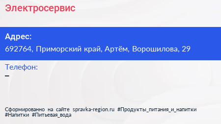 Электросервис по адресу 692764, Приморский край, Артём, Ворошилова, 29 в дальнейшем Организация, размещена в следующих категориях:
