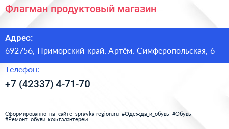 Флагман, продуктовый магазин по адресу 692756, Приморский край, Артём, Симферопольская, 6 в дальнейшем Организация, размещена в следующих категориях: