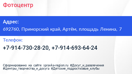 Фотоцентр по адресу 692760, Приморский край, Артём, площадь Ленина, 7 в дальнейшем Организация, размещена в следующих категориях: