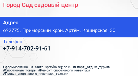 Город Сад, садовый центр по адресу 692775, Приморский край, Артём, Каширская, 30 в дальнейшем Организация, размещена в следующих категориях: