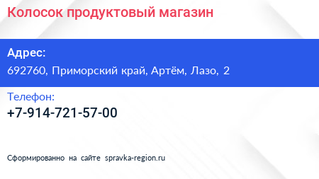 Колосок, продуктовый магазин по адресу 692760, Приморский край, Артём, Лазо, 2 в дальнейшем Организация, размещена в следующих категориях: