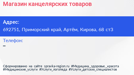 Магазин канцелярских товаров по адресу 692751, Приморский край, Артём, Кирова, 68 ст3 в дальнейшем Организация, размещена в следующих категориях: