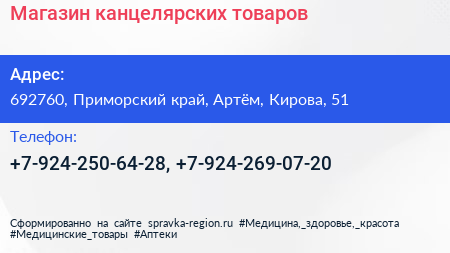 Магазин канцелярских товаров по адресу 692760, Приморский край, Артём, Кирова, 51 в дальнейшем Организация, размещена в следующих категориях: