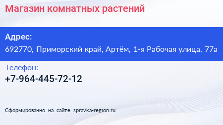 Магазин комнатных растений по адресу 692770, Приморский край, Артём, 1-я Рабочая улица, 77а в дальнейшем Организация, размещена в следующих категориях: