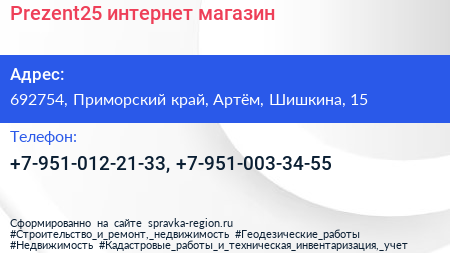 Prezent25, интернет-магазин по адресу 692754, Приморский край, Артём, Шишкина, 15 в дальнейшем Организация, размещена в следующих категориях: