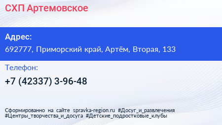 СХП Артемовское по адресу 692777, Приморский край, Артём, Вторая, 133 в дальнейшем Организация, размещена в следующих категориях: