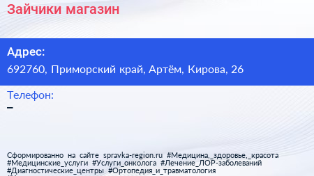 Зайчики, магазин по адресу 692760, Приморский край, Артём, Кирова, 26 в дальнейшем Организация, размещена в следующих категориях: