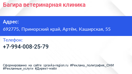 Багира, ветеринарная клиника по адресу 692775, Приморский край, Артём, Каширская, 55 в дальнейшем Организация, размещена в следующих категориях: