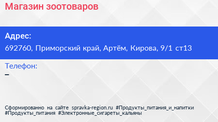 Магазин зоотоваров по адресу 692760, Приморский край, Артём, Кирова, 9/1 ст13 в дальнейшем Организация, размещена в следующих категориях: