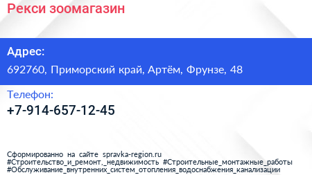 Рекси, зоомагазин по адресу 692760, Приморский край, Артём, Фрунзе, 48 в дальнейшем Организация, размещена в следующих категориях: