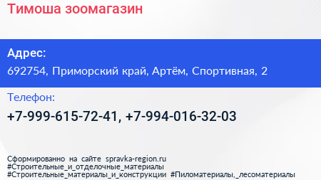 Тимоша, зоомагазин по адресу 692754, Приморский край, Артём, Спортивная, 2 в дальнейшем Организация, размещена в следующих категориях: