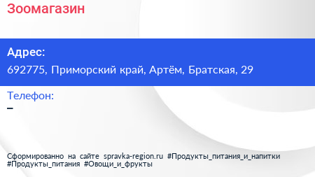 Зоомагазин по адресу 692775, Приморский край, Артём, Братская, 29 в дальнейшем Организация, размещена в следующих категориях: