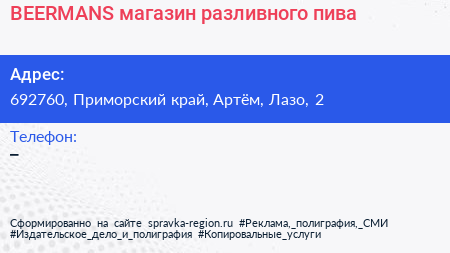 BEERMANS, магазин разливного пива по адресу 692760, Приморский край, Артём, Лазо, 2 в дальнейшем Организация, размещена в следующих категориях: