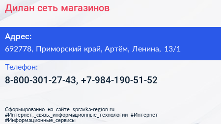 Дилан, сеть магазинов по адресу 692778, Приморский край, Артём, Ленина, 13/1 в дальнейшем Организация, размещена в следующих категориях: