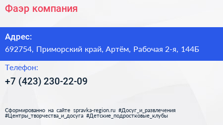 Фаэр, компания по адресу 692754, Приморский край, Артём, Рабочая 2-я, 144Б в дальнейшем Организация, размещена в следующих категориях: