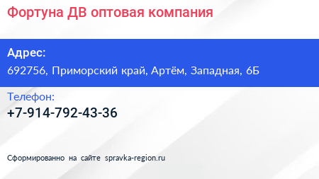 Фортуна-ДВ, оптовая компания по адресу 692756, Приморский край, Артём, Западная, 6Б в дальнейшем Организация, размещена в следующих категориях: