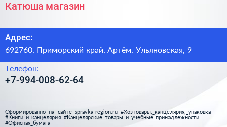 Катюша, магазин по адресу 692760, Приморский край, Артём, Ульяновская, 9 в дальнейшем Организация, размещена в следующих категориях: