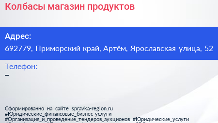 Колбасы, магазин продуктов по адресу 692779, Приморский край, Артём, Ярославская улица, 52 в дальнейшем Организация, размещена в следующих категориях: