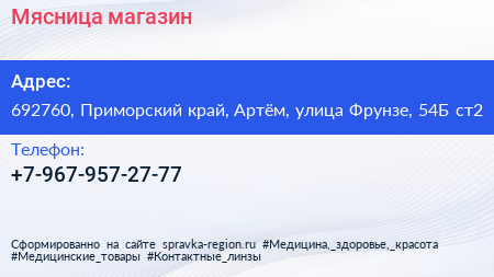Мясница, магазин по адресу 692760, Приморский край, Артём, улица Фрунзе, 54Б ст2 в дальнейшем Организация, размещена в следующих категориях: