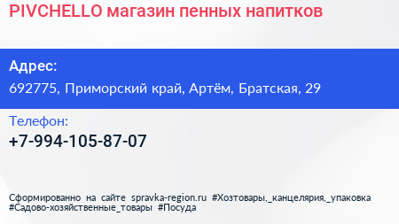 PIVCHELLO, магазин пенных напитков по адресу 692775, Приморский край, Артём, Братская, 29 в дальнейшем Организация, размещена в следующих категориях: