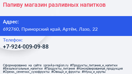 Папиву, магазин разливных напитков по адресу 692760, Приморский край, Артём, Лазо, 22 в дальнейшем Организация, размещена в следующих категориях:
