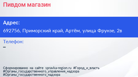 Пивдом, магазин по адресу 692756, Приморский край, Артём, улица Фрунзе, 2в в дальнейшем Организация, размещена в следующих категориях: