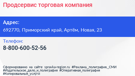 Продсервис, торговая компания по адресу 692770, Приморский край, Артём, Новая, 23 в дальнейшем Организация, размещена в следующих категориях: