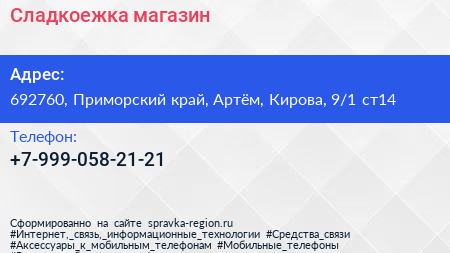 Сладкоежка, магазин по адресу 692760, Приморский край, Артём, Кирова, 9/1 ст14 в дальнейшем Организация, размещена в следующих категориях: