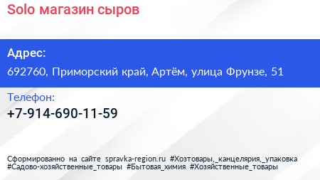 Solo, магазин сыров по адресу 692760, Приморский край, Артём, улица Фрунзе, 51 в дальнейшем Организация, размещена в следующих категориях:
