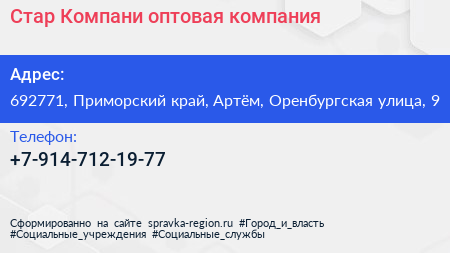 Стар Компани, оптовая компания по адресу 692771, Приморский край, Артём, Оренбургская улица, 9 в дальнейшем Организация, размещена в следующих категориях: