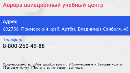 Аврора, авиационный учебный центр по адресу 692756, Приморский край, Артём, Владимира Сайбеля, 45 в дальнейшем Организация, размещена в следующих категориях: