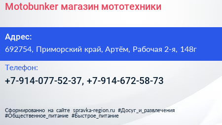 Motobunker, магазин мототехники по адресу 692754, Приморский край, Артём, Рабочая 2-я, 148г в дальнейшем Организация, размещена в следующих категориях: