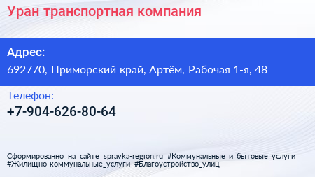 Уран, транспортная компания по адресу 692770, Приморский край, Артём, Рабочая 1-я, 48 в дальнейшем Организация, размещена в следующих категориях: