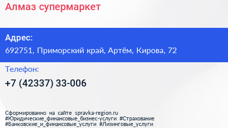 Алмаз, супермаркет по адресу 692751, Приморский край, Артём, Кирова, 72 в дальнейшем Организация, размещена в следующих категориях:
