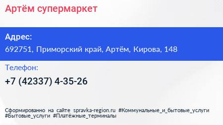 Артём, супермаркет по адресу 692751, Приморский край, Артём, Кирова, 148 в дальнейшем Организация, размещена в следующих категориях: