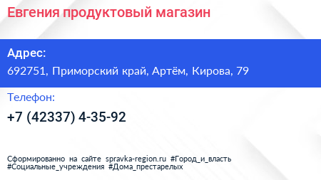 Евгения, продуктовый магазин по адресу 692751, Приморский край, Артём, Кирова, 79 в дальнейшем Организация, размещена в следующих категориях: