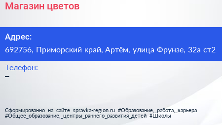 Магазин цветов по адресу 692756, Приморский край, Артём, улица Фрунзе, 32а ст2 в дальнейшем Организация, размещена в следующих категориях: