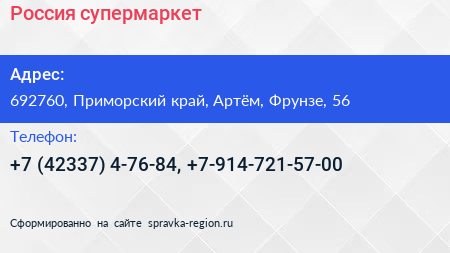 Россия, супермаркет по адресу 692760, Приморский край, Артём, Фрунзе, 56 в дальнейшем Организация, размещена в следующих категориях: