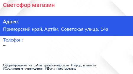 Светофор, магазин по адресу Приморский край, Артём, Советская улица, 14а в дальнейшем Организация, размещена в следующих категориях: