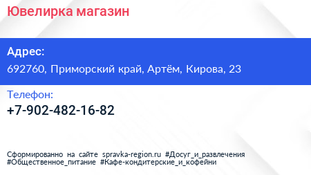 Ювелирка, магазин по адресу 692760, Приморский край, Артём, Кирова, 23 в дальнейшем Организация, размещена в следующих категориях: