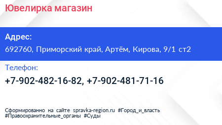 Ювелирка, магазин по адресу 692760, Приморский край, Артём, Кирова, 9/1 ст2 в дальнейшем Организация, размещена в следующих категориях: