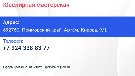 Ювелирная мастерская по адресу 692760, Приморский край, Артём, Кирова, 9/1 в дальнейшем Организация, размещена в следующих категориях: