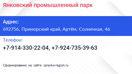 Янковский, промышленный парк по адресу 692756, Приморский край, Артём, Солнечная, 46 в дальнейшем Организация, размещена в следующих категориях: