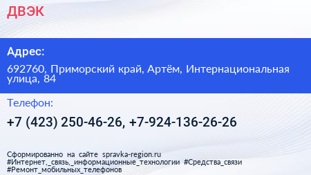 ДВЭК по адресу 692760, Приморский край, Артём, Интернациональная улица, 84 в дальнейшем Организация, размещена в следующих категориях: